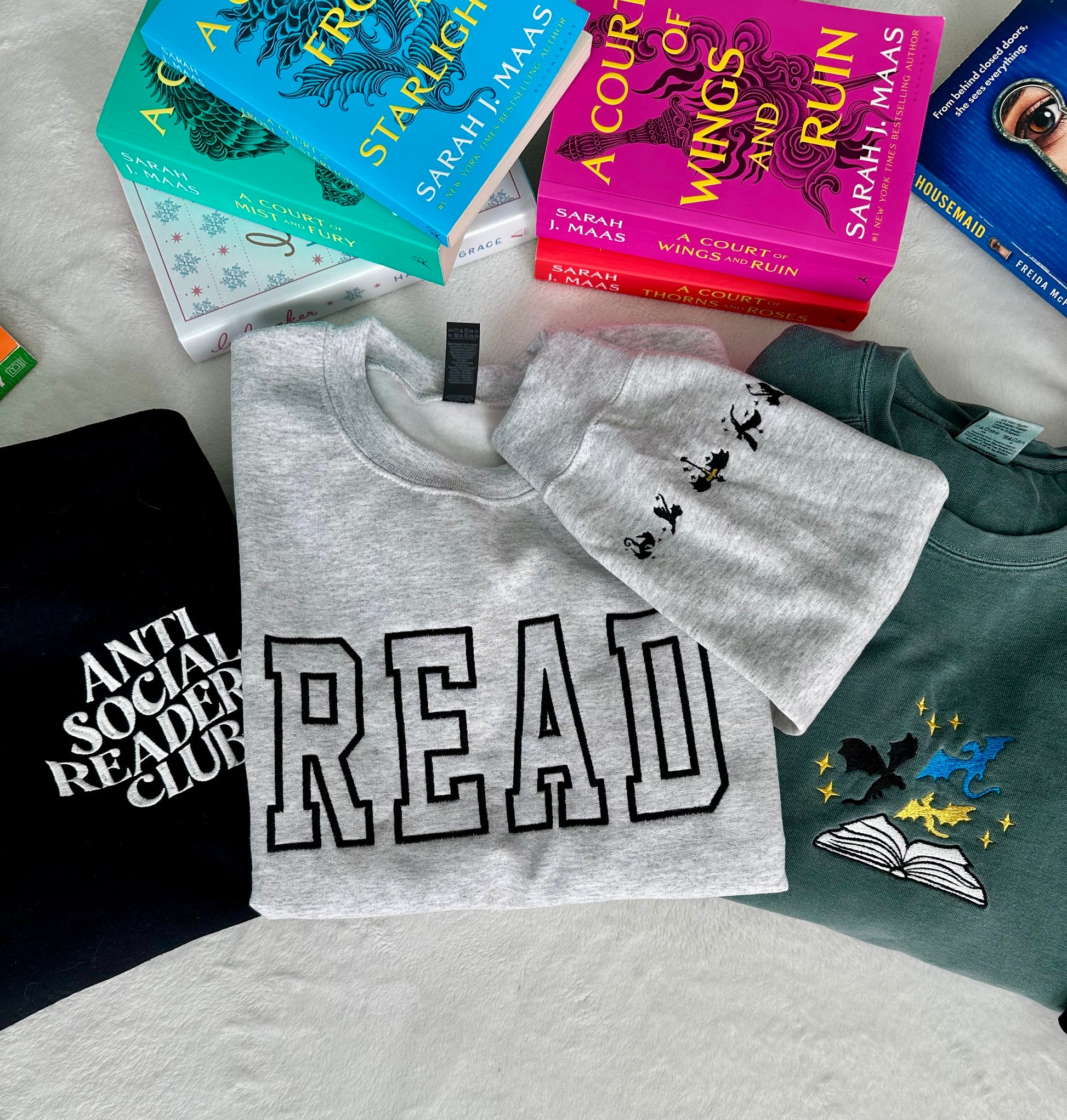 Our READ embroidered crewneck features bold lettering stitched across the front, paired with embroidered dragon details along the sleeve for a subtle nod to fantasy lovers and bookish worlds.